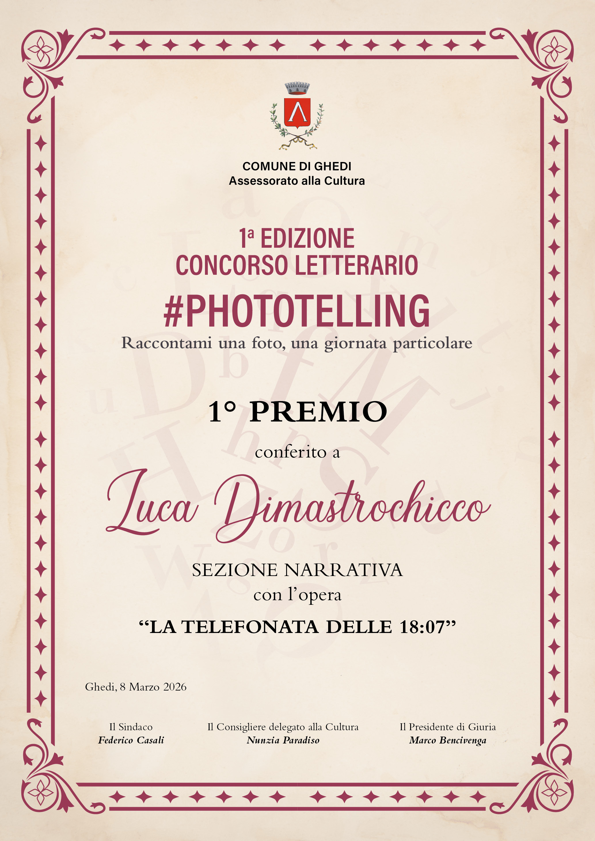 1° - Luca Dimastrochicco di Barletta con l’opera LA TELEFONATA DELLE 18:07, buono libri dal valore di € 250,00, antologia ed attestato
