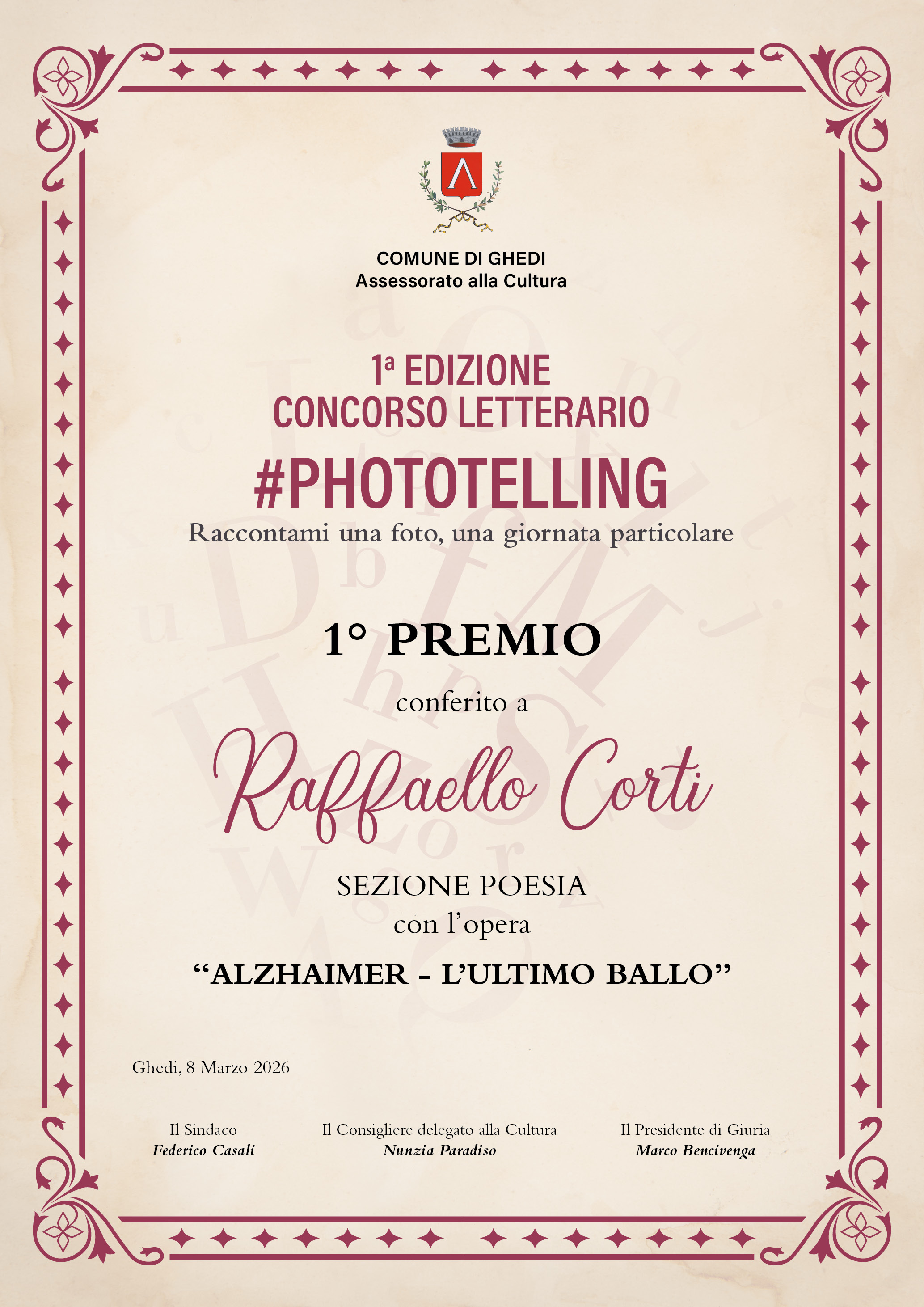1° - Raffaello Corti di Bergamo con l’opera ALZEHEIMER L’ ULTIMO BALLO, buono libri dal valore di € 250,00, antologia ed attestato