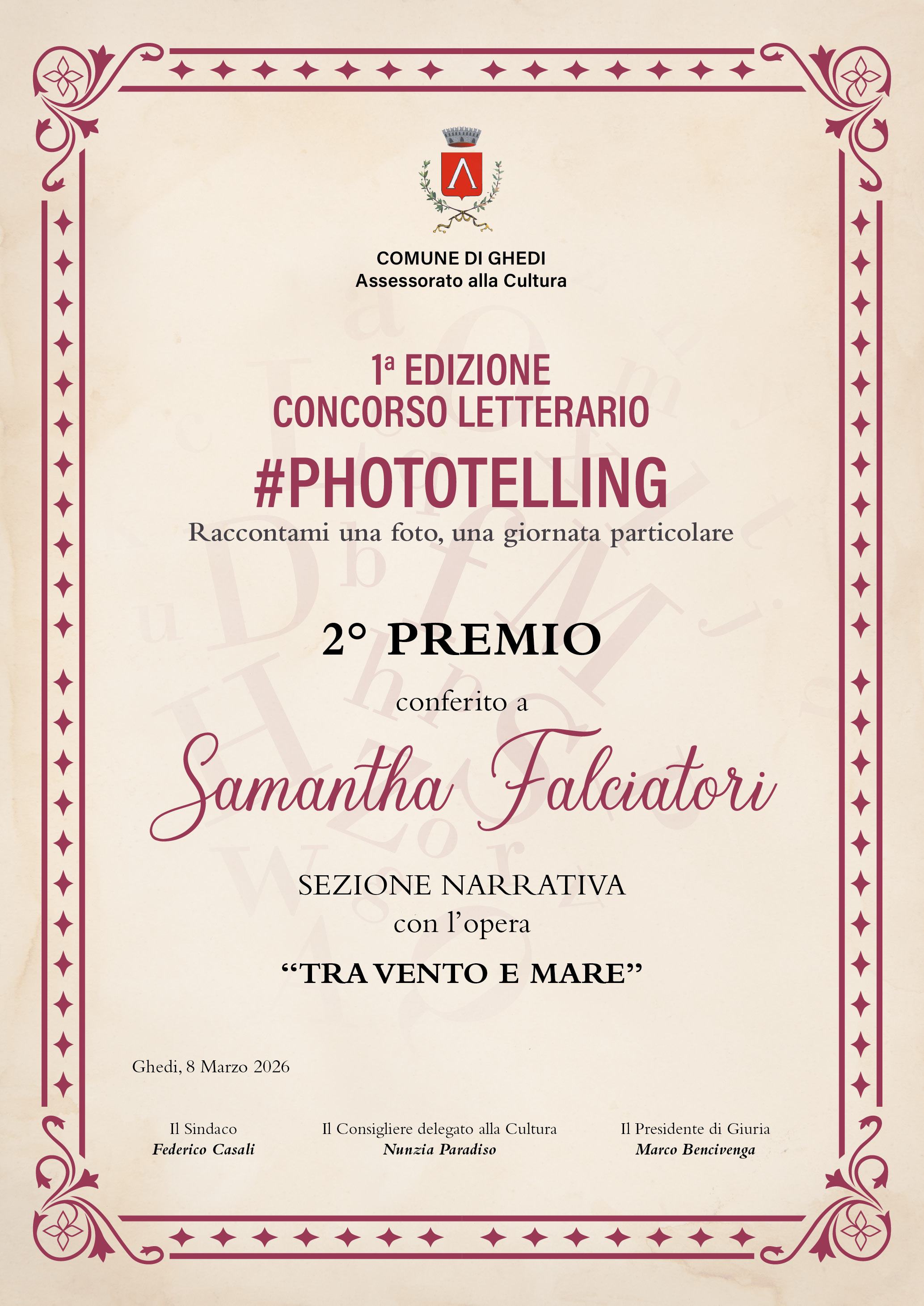 2° - Samantha Falciatori di Terni con l’ opera TRA VENTO E MARE, buono libri dal valore di € 150,00, antologia ed attestato
