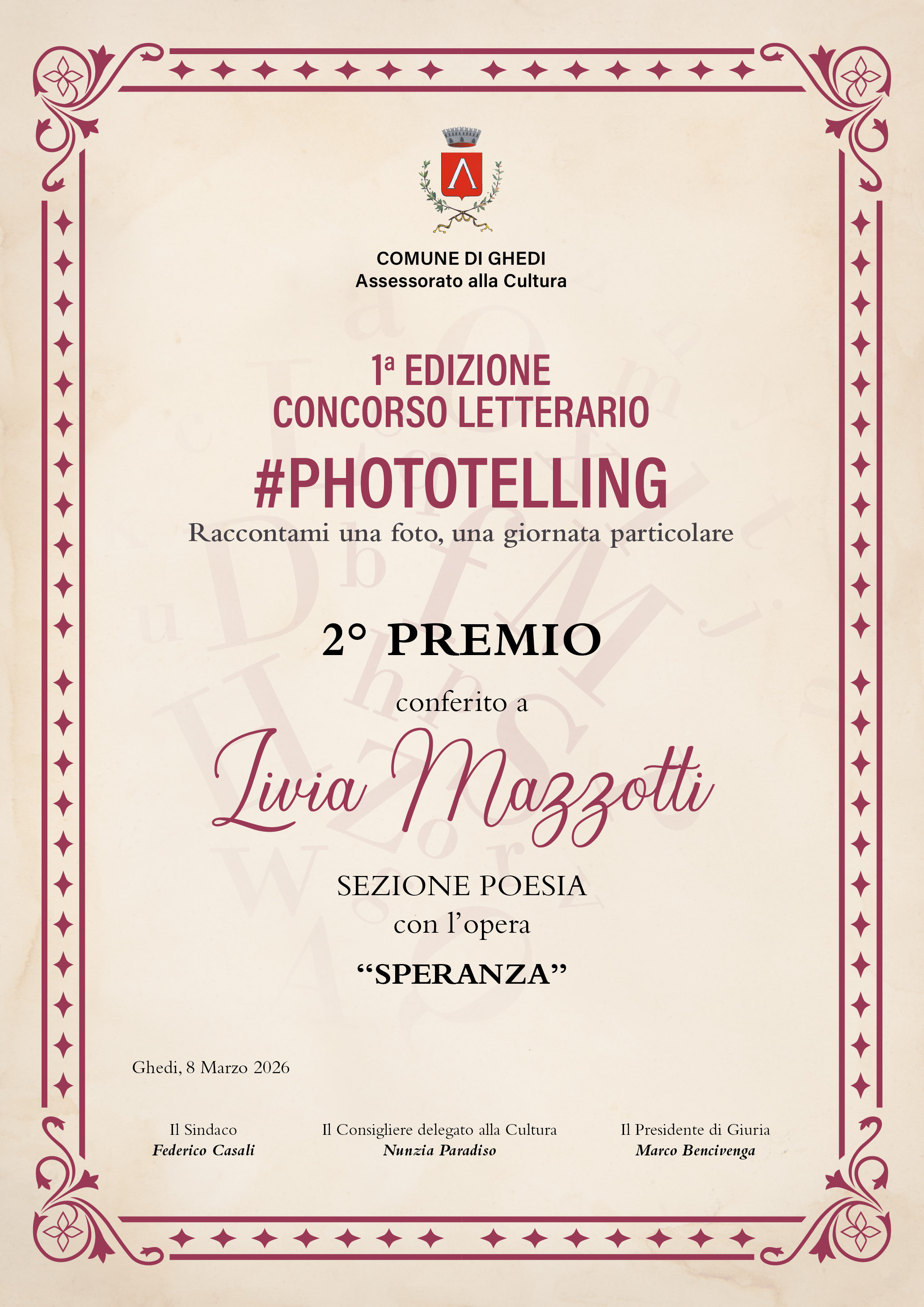 2° - Livia Mazzotti di Gambara con l’ opera SPERANZA, buono libri dal valore di € 150,00, antologia ed attestato