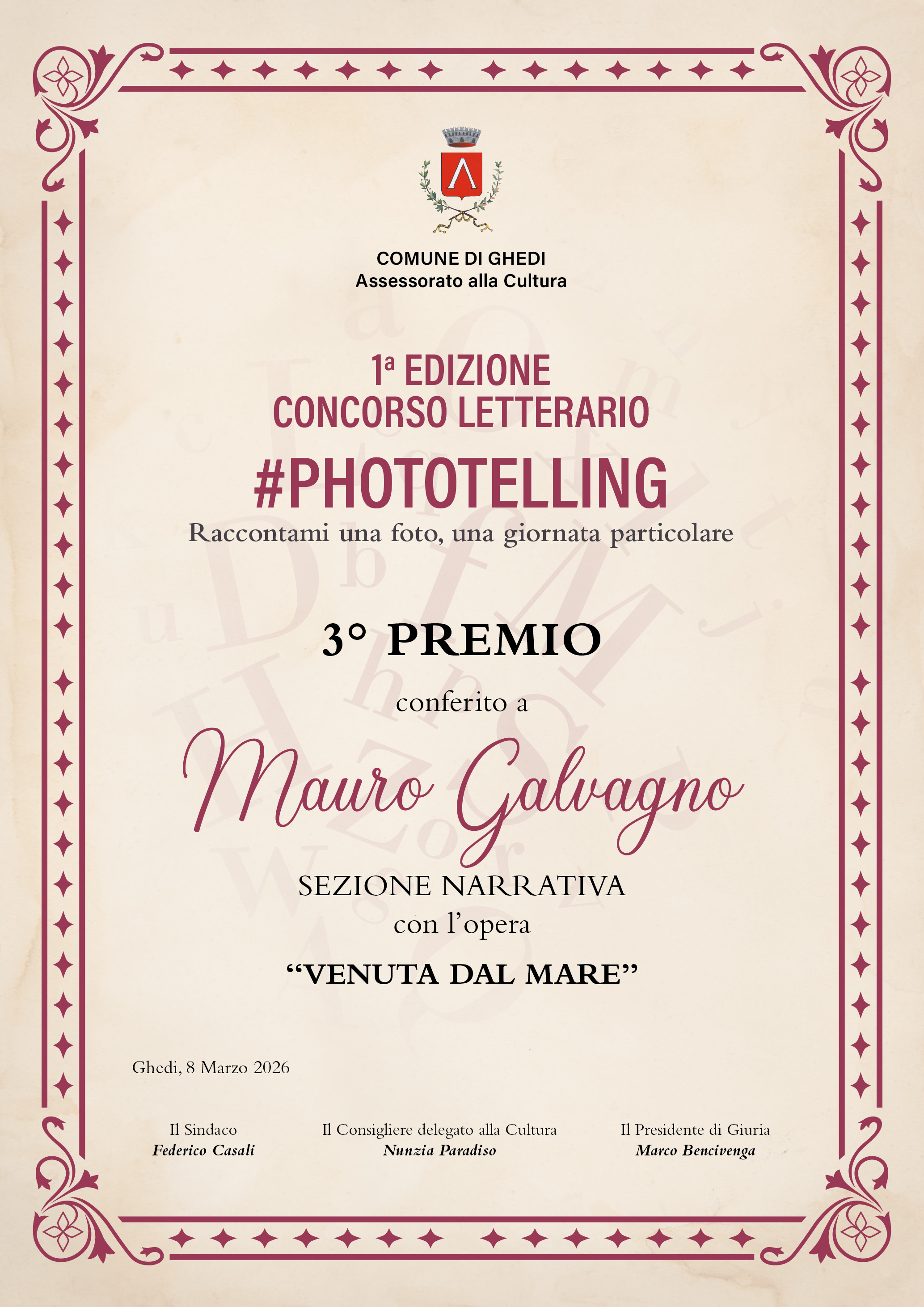 3° - Mauro Galvagno di Verona con l’opera VENUTA DAL MARE, buono libri dal valore di € 100,00, antologia ed attestato